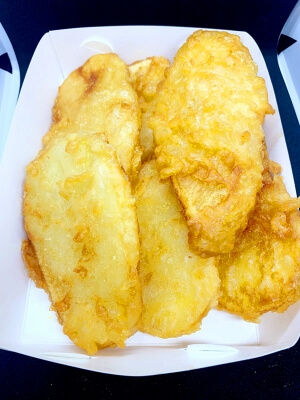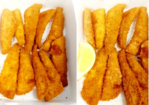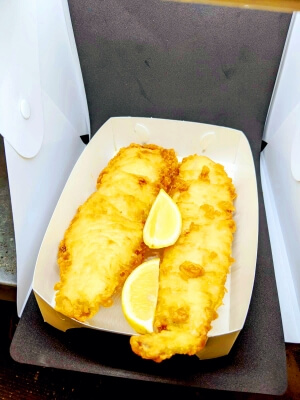 2 Fish fillets, 2 Patato Scallops, 2 Prawns Cutlets and small chips with large sauce